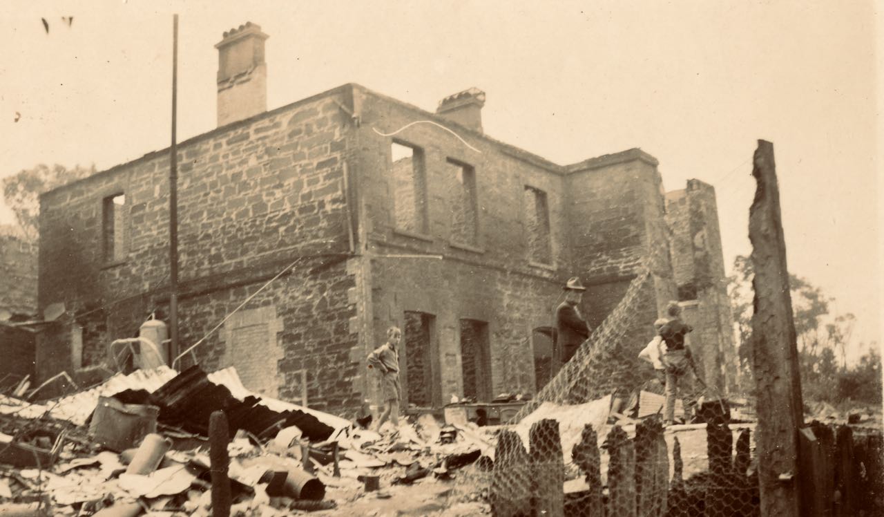 After the 1939 bushfire, only the stone walls of Waverley were left. Fires appeared to have meet near this residence after travelling from the north and south behind Lorne. The bush was still burning at the back of the township at night, but, with so much undergrowth destroyed, the danger apparently had passed. Waverley was built incredibly solid, its outer walls being blue stone rock withstood the fire extra well. They were certainly strong and with high workmanship. When Horrie Williams and Bill Lynch rebuilt Waverley, they incorporated the same walls without touching them.