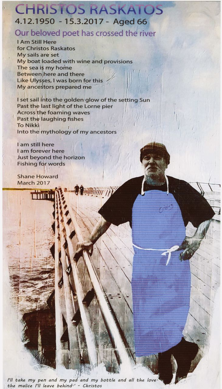 Christos considers his talent a gift which he has a moral obligation to cultivate and share. We who read his poems and visit his fish shop are the fortunate recipients. His poems not only record local events, situations and special characters that inspire him but occasionally he gives us a glimpse of his soul. “Mostly you see about 80% of me but sometimes I show 100% – like the time I wrote about the death of my friend Allan Patterson.” This beautiful poem is on the shop wall pinned to the obituary from the paper.