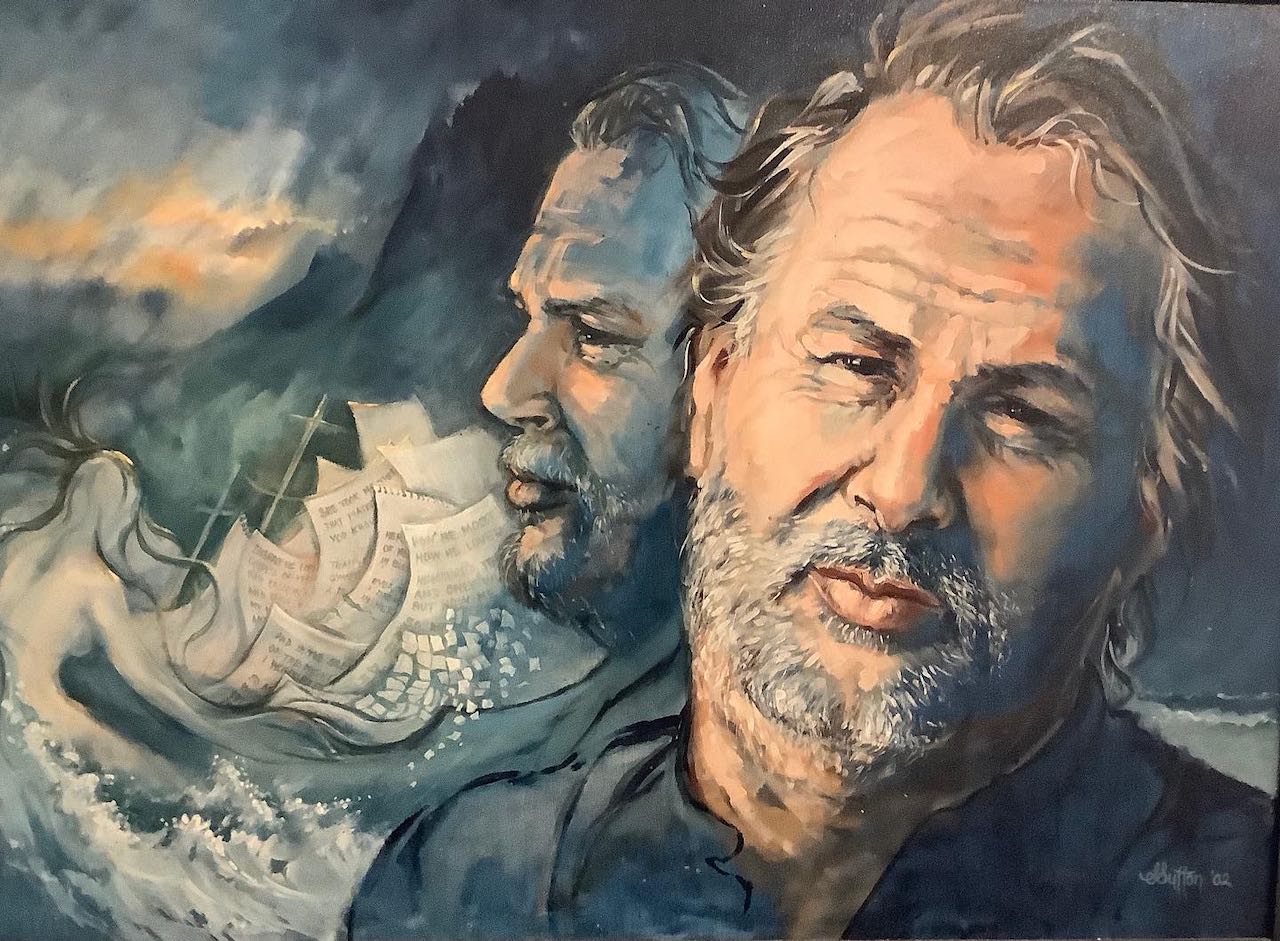 Christos Raskatos, was a poet and fishmonger, and a larger-than-life character. He wrote poetry and taped it to the fishery windows offered personal messages of love and loss within the community. In 2002, Susan’s painted a portrait of Christos and was hung behind the Lorne Fisheries shop counter beside the Rob Coy fish paintings.