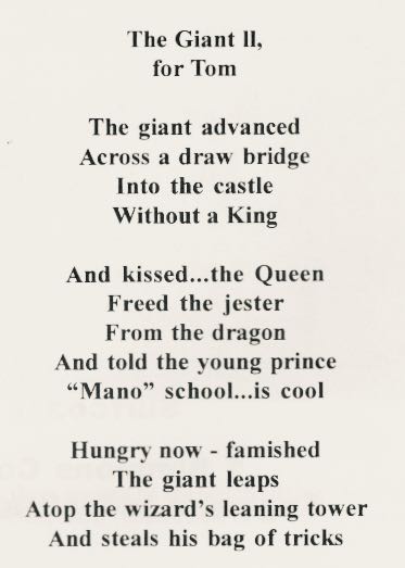 Tom’s Geelong School recognise and encourage his writing. It looks as if they have embraced his Dad as well, as their joint poems appear in educational publications. The poem I’ve included here was written by them both one Saturday morning while sitting outside the Manifold Heights Primary School, because Tom understands about Muses and believes the Muse lives there. “Who am I to say where the Muse lives?” Christos asks. I couldn’t help hoping that this Muse might be the one to convince him to put his life’s work in a book, part of which would be a proud poet’s recorded history of Lorne when he lived here but all of which would be a treasure his son could hold to his chest and say proudly, “This is my Dad”